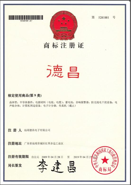 是汕尾德昌電子有限公司在中國的注冊商標(biāo)之一,受法律保護(hù),侵權(quán)必究。 未經(jīng)汕尾德昌電子有限公司書面許可,任何單位和個(gè)人不得以任何方式或理由對(duì)該商標(biāo)